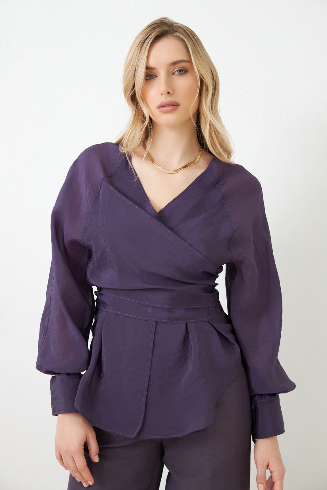 Purple Double Breasted Collar Tie Detail Long Sleeve Blouse quantity