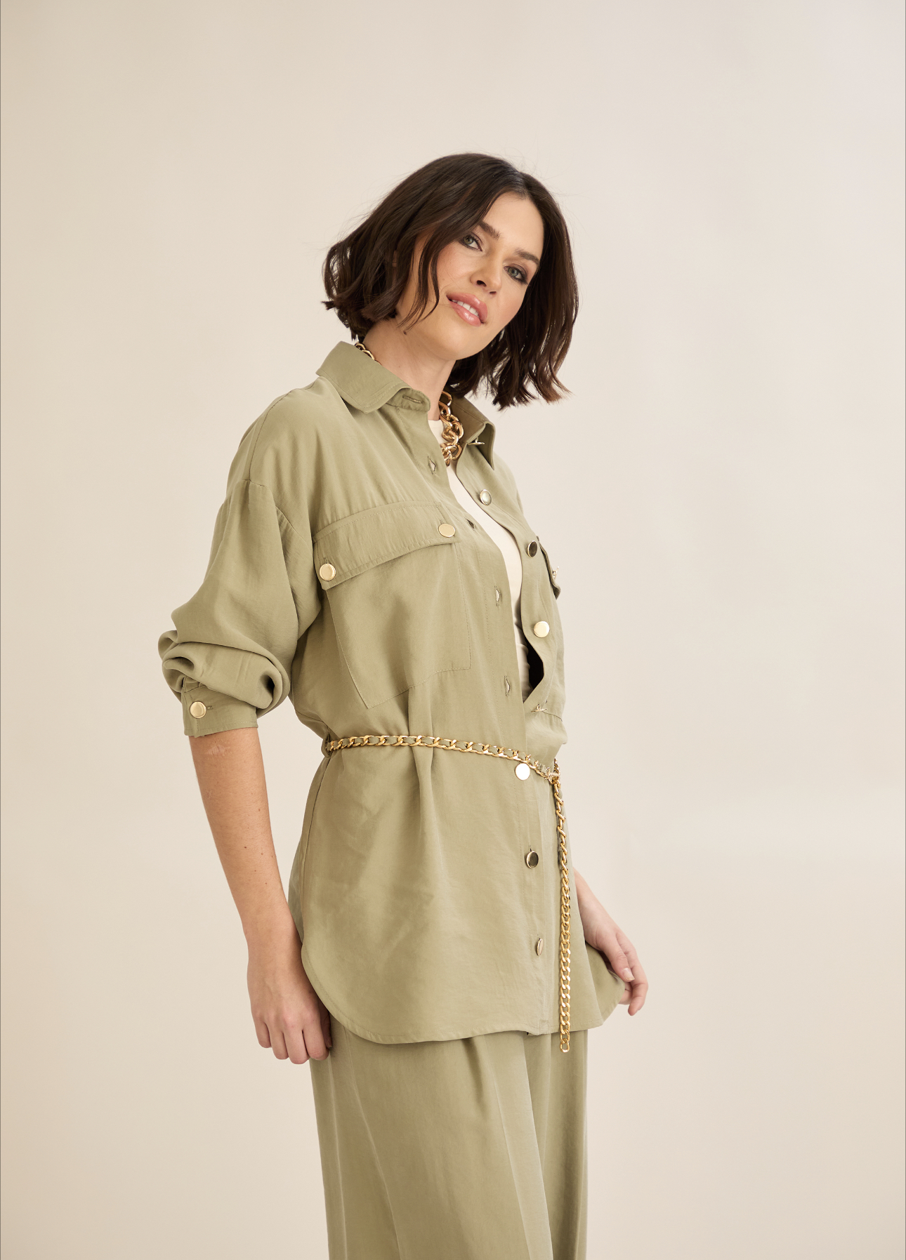 Shirt Detailed With Gold Buttons And Belt – Olive Green